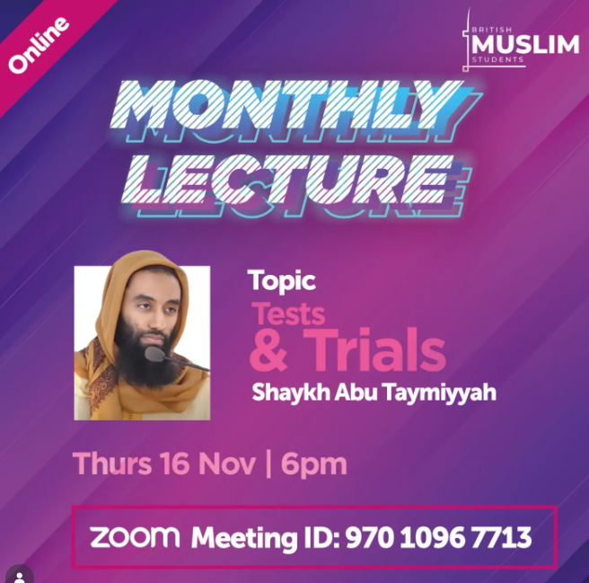 The lecture will be delivered by Shaykh Abu Taymiyyah on Thursday 16th November at 6pm